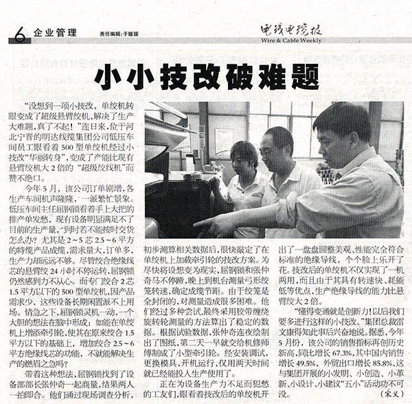 《电线电缆报》2018年6月29日第6版发表来自金年会金字招牌诚信至上线缆集团的新闻特写《小小技改破难题》,全为如下: